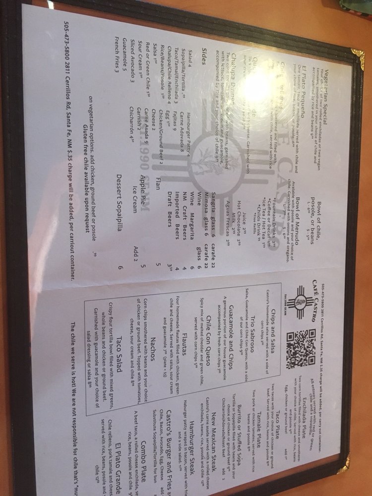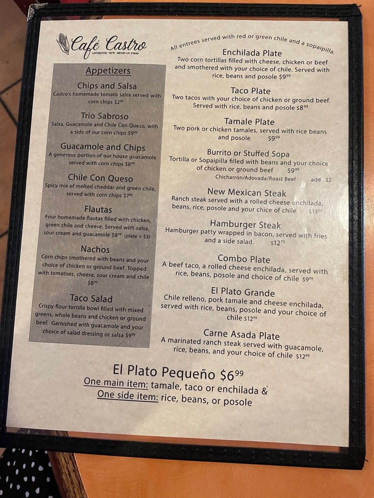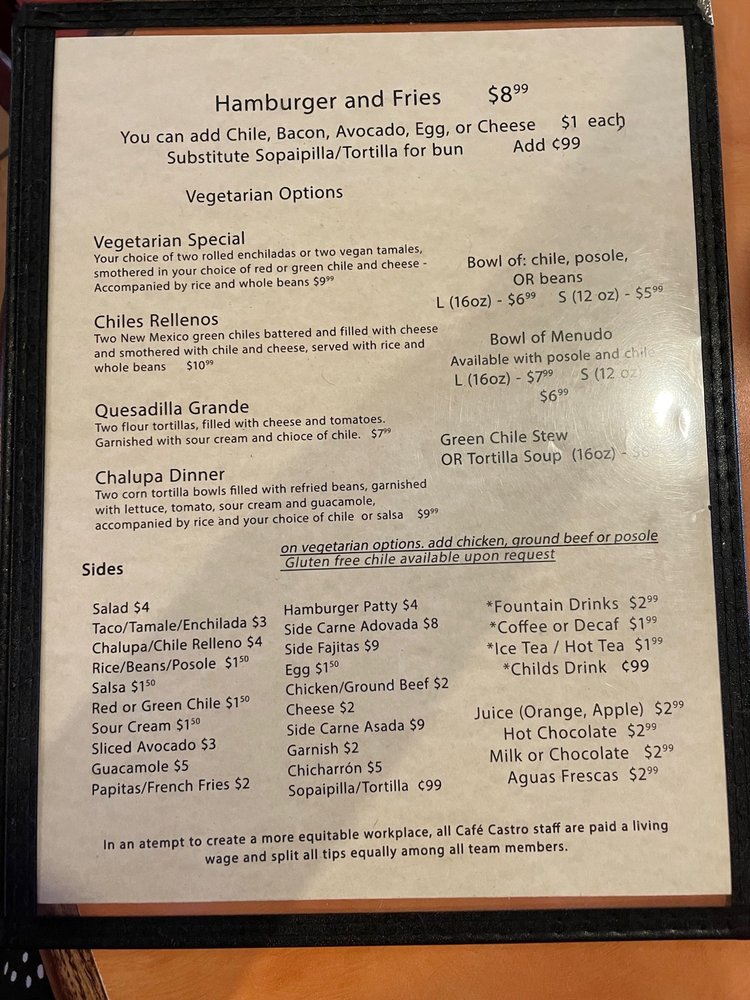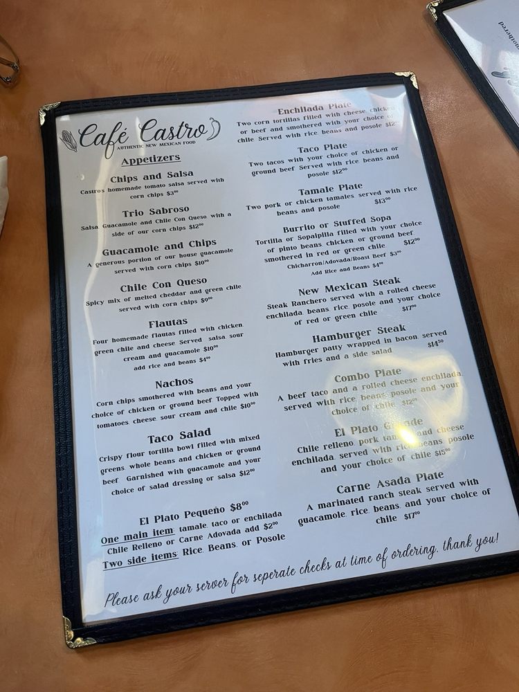 Introducing the menu at Café Castro - a New Mexican Cuisine gem in Santa Fe. This Latinx and Women-owned restaurant offers a plethora of options, including appetizers like Trio Sabroso and Santa Fe Chicken Salad, enticing entrees like Carne Asada Plate and Blue Corn Enchiladas, and delicious brunch items like New Mexico Omelet and Tortilla Burger. The reviews rave about the exceptional food quality, reasonable prices, and attentive service. Standout dishes like Chile Relleno and Enchiladas have diners coming back for more. The cozy atmosphere and diverse menu cater to all tastes, with options for vegans, vegetarians, and meat-lovers alike. Café Castro is a must-visit for those seeking authentic New Mexican flavors with a personal touch.